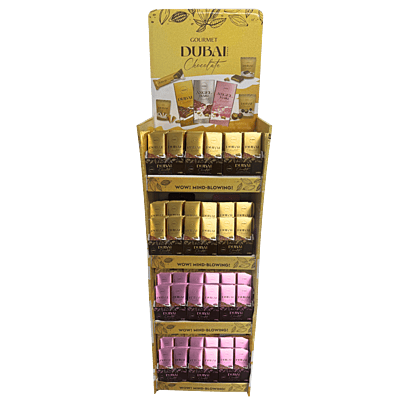 Constituents.. 1) [XPC1000]BeeMax Dubai Style Chocolate Bar 7.0oz - 72 PCS 2) [XPC2001]BeeMax Raspberry Angel Hair Dubai Chocolate Bar 7.0oz - 72 PCS 3) [XPBM0001]BeeMax Dubai Corrugated FDU Display - 1 FDU